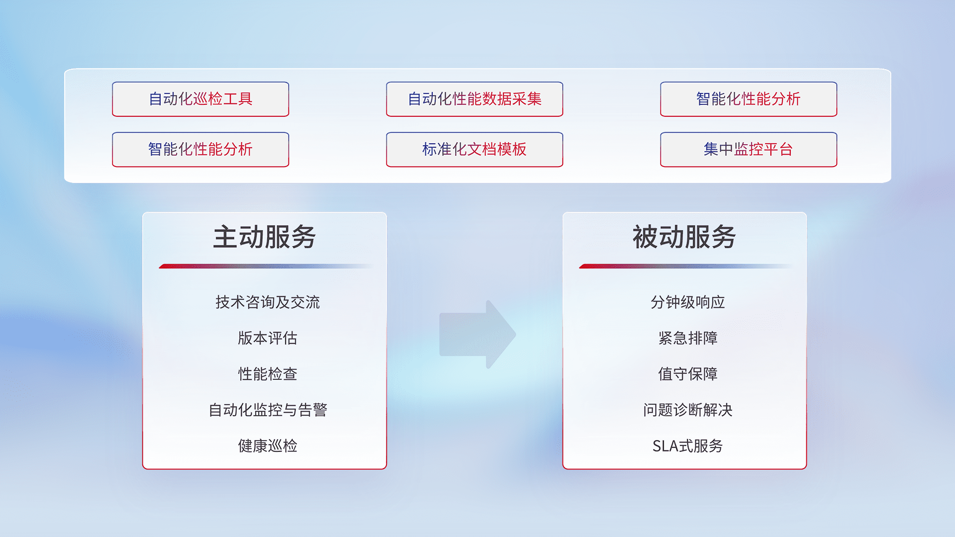 智能化工具和标准化文档,,保障服务质量,,,,提供主动服务(包含技术咨询、、、版本评估、、性能检查、、自动化监控与告警、、、健康巡检)和被动服务包含(分钟级响应、、、、紧急排障、、、值守保障、、、问题诊断解决、、SLA服务)。。。。